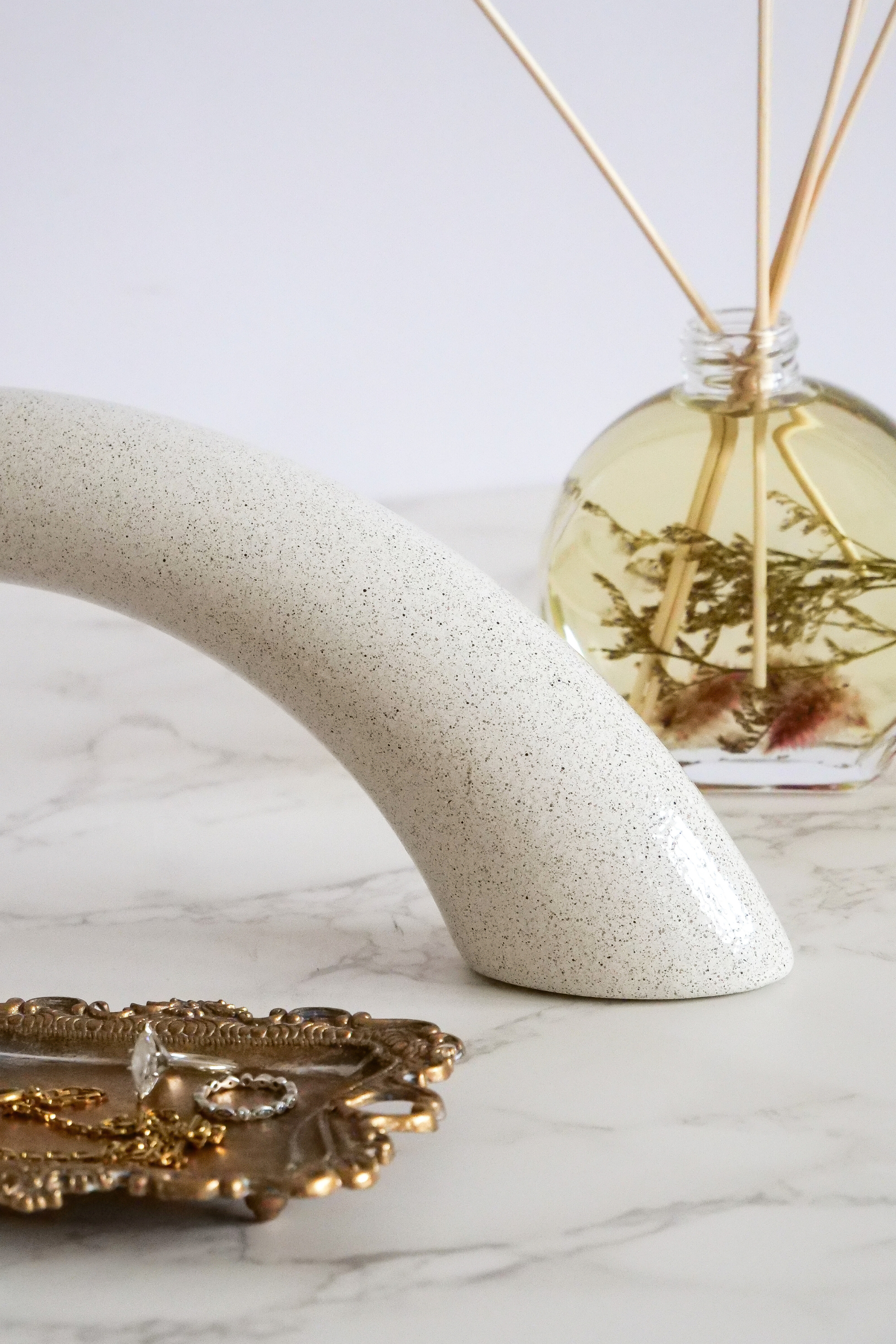 To estetyczne podejście do domowych ćwiczeń, w którym dekoracyjne ciężarki stają się naturalną częścią przestrzeni i codziennego rytuału ruchu.